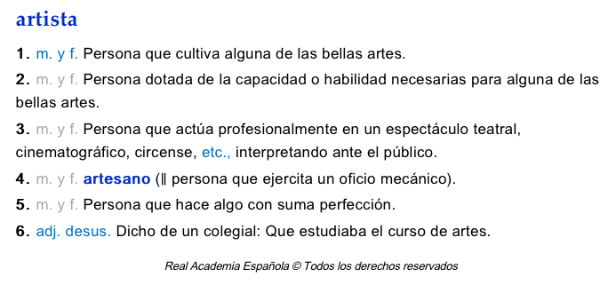 Las palabras no son objetos inamovibles: cambian, mutan y se deforman. Como lo hace el pensamiento que las sustenta. Las palabras se alimentan de percepciones y valores. ¿Es esta una sociedad que valora al artista en función de su capacidad de crear belleza? ¿Lo valora en función de su capacidad de representarnos la realidad? ¿Lo valora en función de su capacidad de generar debates que transformen esa realidad? Que la palabra artista pueda tener una acepción próxima a holgazán o pícaro no sólo es falso, sino que también es un fracaso de la sociedad.